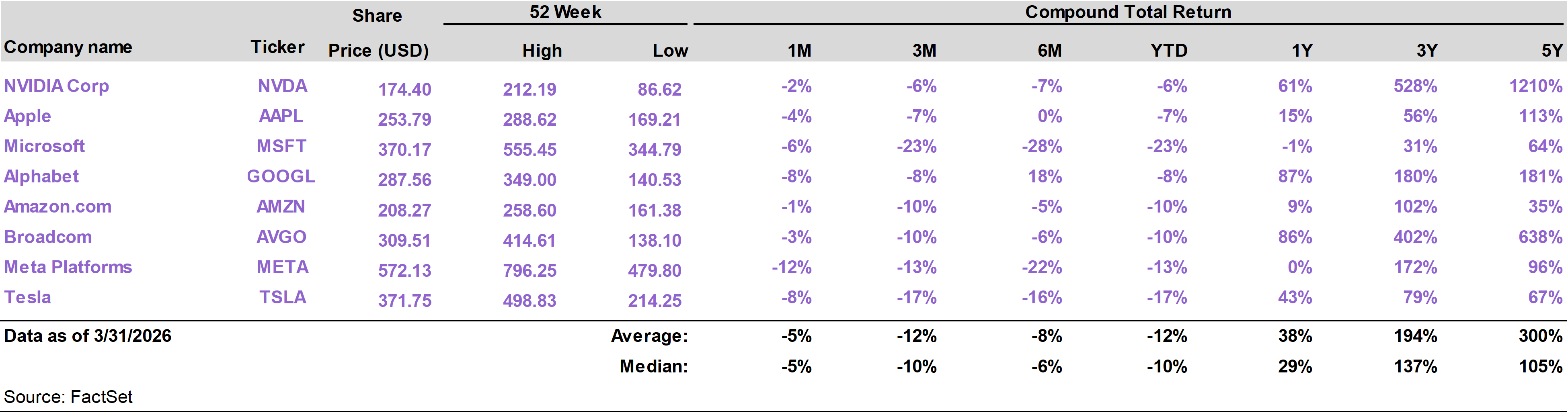 META trades at 19x current year earnings, slightly below the broader market multiple (20x) and the lowest in the group. Yet META is expected to grow earnings at a mid to high teens rate over the next two years, with potential acceleration later on as AI investments pay off.